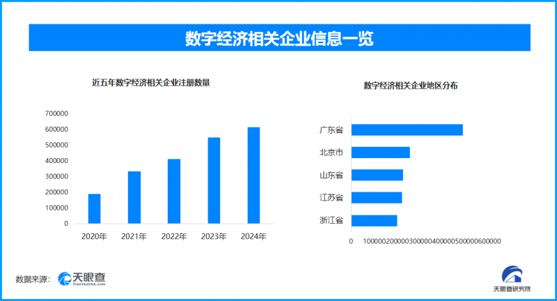天眼查数据显示,现存数字经济相关企业259万余家,2025年1月到现在新增注册相关企业50万余家,与2024年同期相比增长51%;