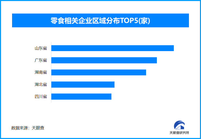 天眼查专业版数据显示,截至目前我国现存在业、存续状态的零食相关企业超561.1万家。从区域分布来看,山东省、广东省、湖南省零食相关企业数量位居前列,三个省市数量总和超过143.8万家,占企业总数的25.6%。