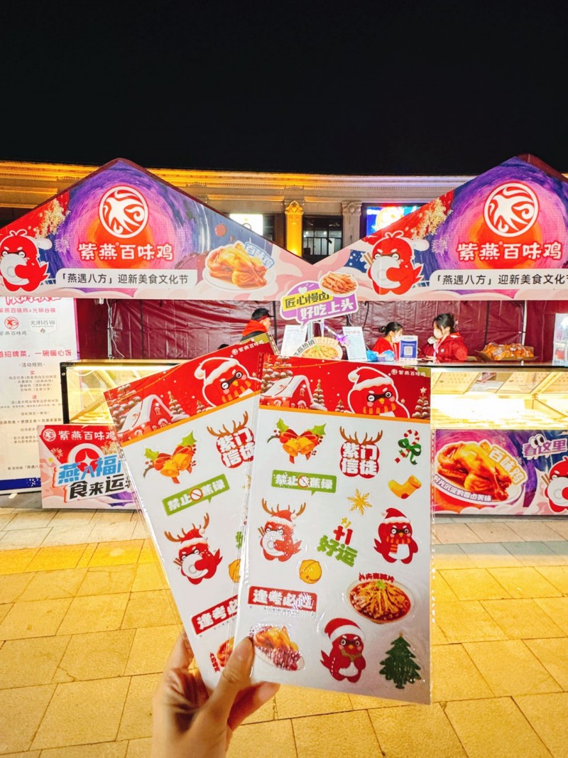 入夜后,“星空幻舞”光影秀点亮广场,金色飞龙与彩凤风筝伴着灯光摇曳,音乐舞台上各类乐曲、演艺轮番登场,让美食节沉浸在温暖的韵律中。此外,“宴遇探索护照”与“食来运转聚福袋”两大玩法进一步提升参与感,游客可通过打卡集章兑换限定礼品,或以68元抽取内含紫燕产品、老字号爆款等的超值盲盒,这种“美食 娱乐 社交”的多维模式,有效延长了消费者停留时间,让“紫燕=有温度的卤味专家”的品牌形象深入人心。