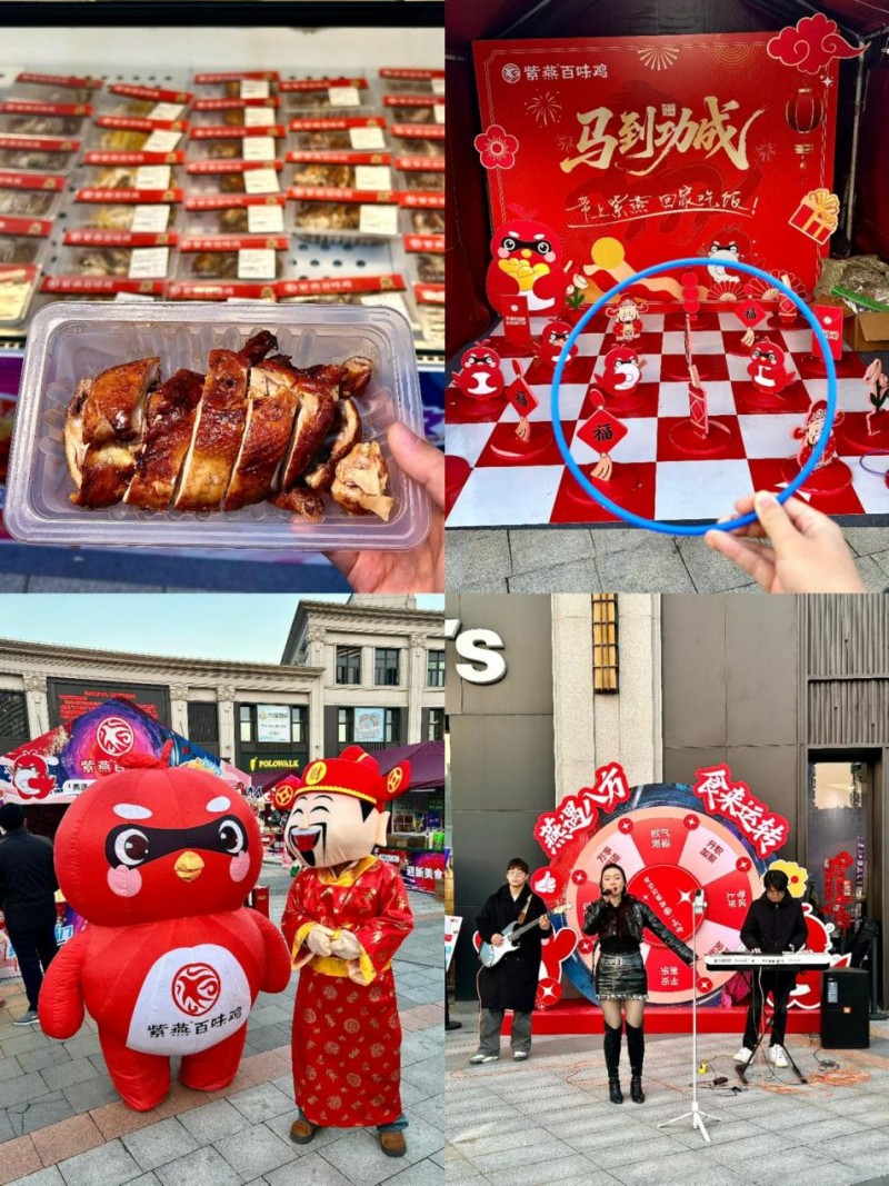 活动期间,“福星高照·惊喜巡游”与“欢乐游园会”成为人气焦点。紫燕年轻化ip形象“胖燕”与财神爷人偶每日随机空降现场,通过合影打卡送限量周边的方式,实现品牌形象的趣味化传播;经典套圈、打气球等怀旧游戏,则以“消费满额免费参与”的机制,有效提升客单价与用户停留时长。