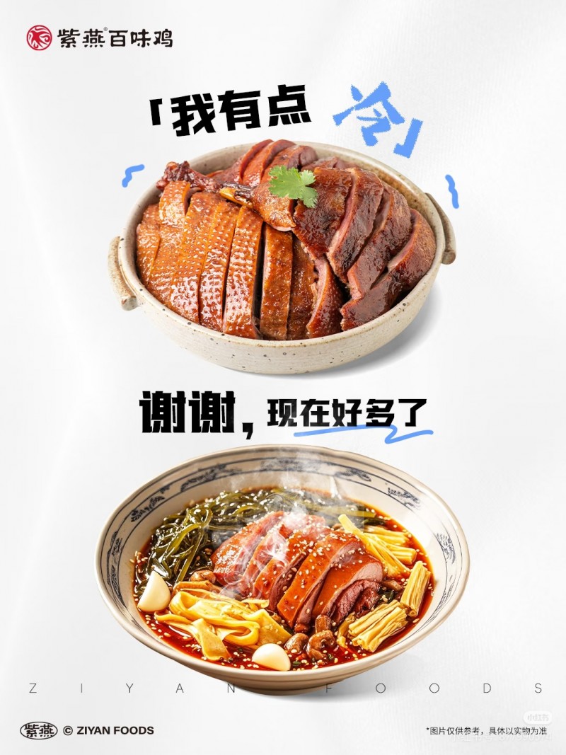 以匠心工艺重构经典卤味边界,精准锚定消费者冬日暖食需求,紫燕百味鸡打造出兼具风味层次与场景适配性的“冒系列”产品矩阵。其中,核心单品“冒烤鸭”凭借软糯丰盈的鸭皮、细嫩多汁的鸭肉,搭配新鲜时蔬打底,碰撞出浓郁复合香气,一口解锁暖冬味蕾盛宴;“冒百味鸡”则延续品牌经典优势,鸡肉嫩滑不柴、鸡皮弹润入味,麻香口感层层递进,暖意直抵心脾。此外,冒猪头肉、冒卤鹅等多元单品同步上新,为消费者抵御严寒提供丰富选择,注入满满温暖能量。